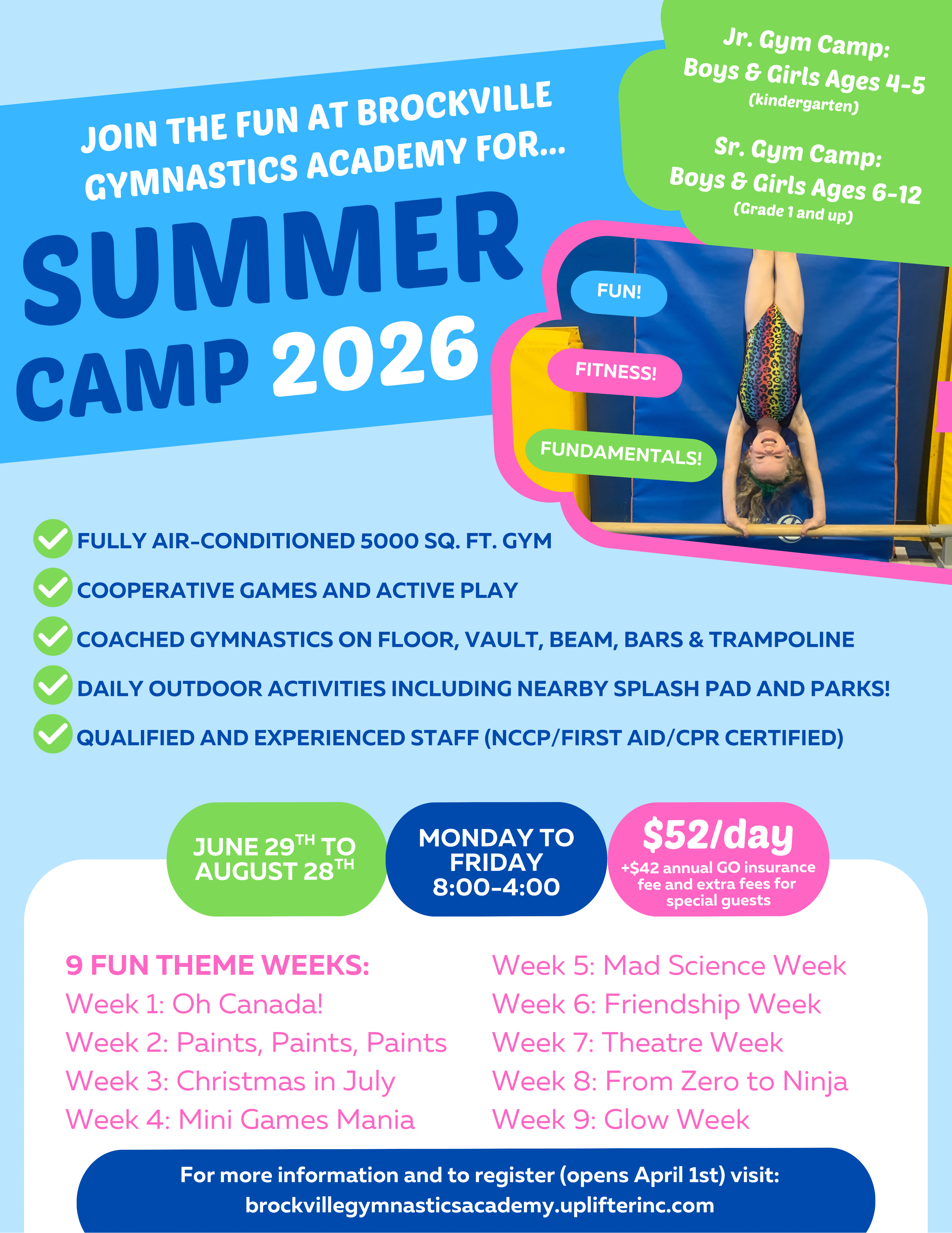 -Annual GO insurance fee of $42 for the 2026-2027 season will also be applied for each participant attending. Gymnastics Ontario year runs July 1, 2026 - June 30th, 2027.