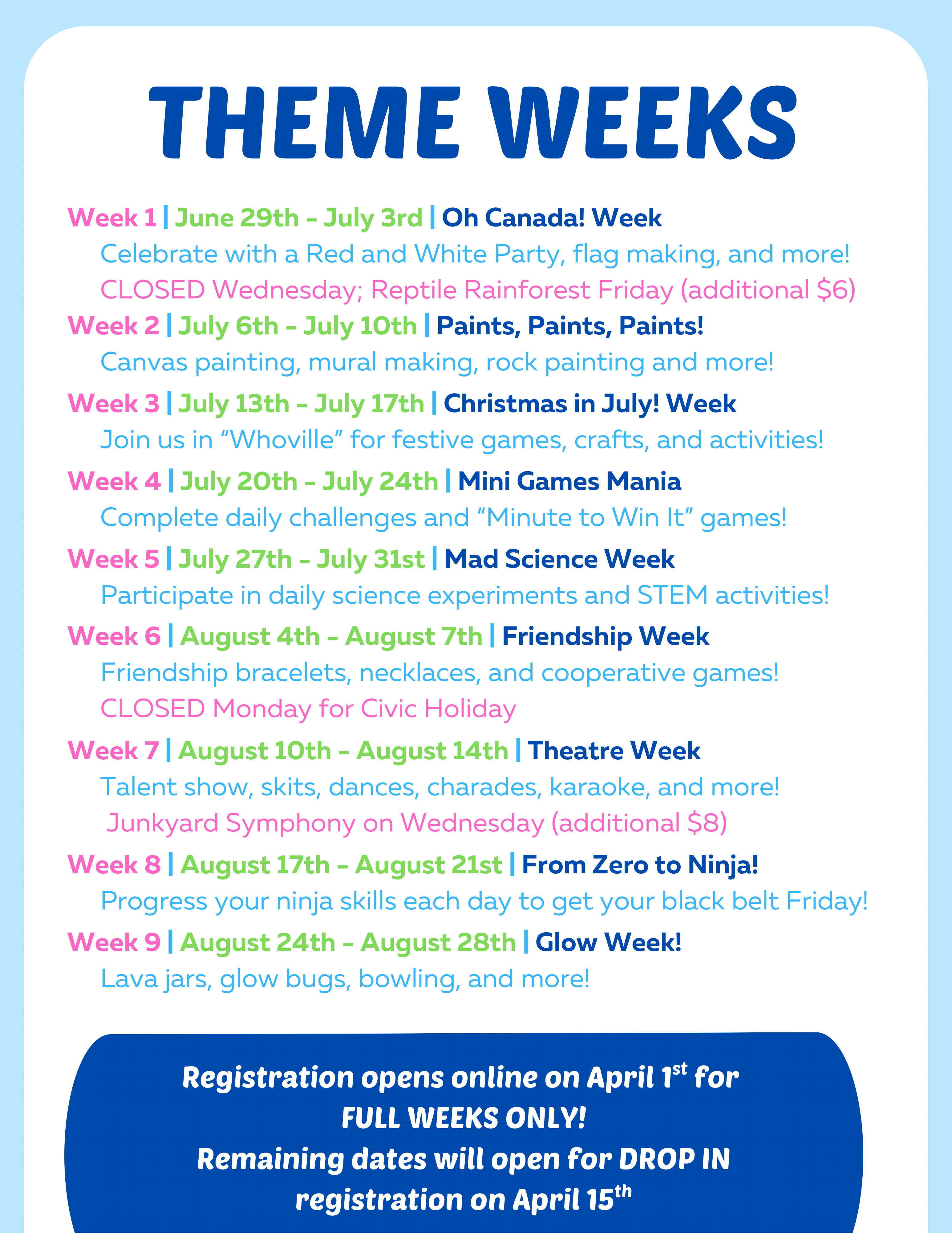 -Registration for full weeks will open April 1st, 2026 at 8:00 a.m.